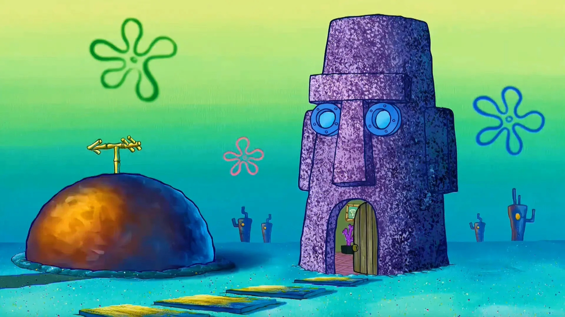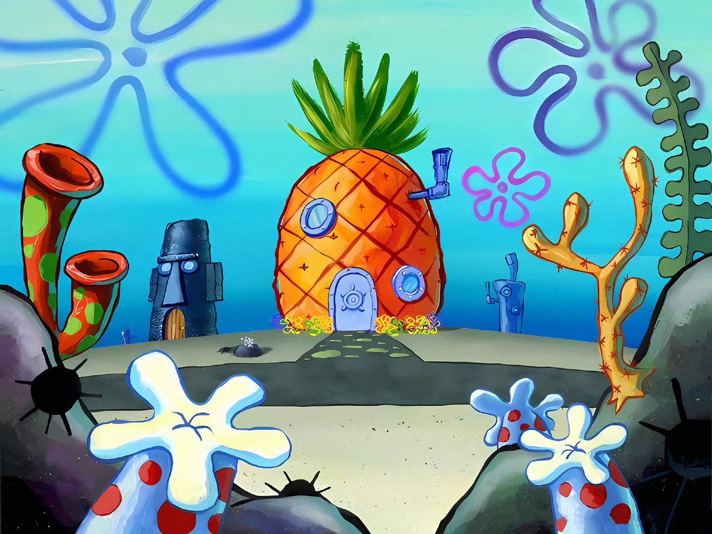 海绵宝宝是方块形的黄色海绵,住在比基尼海滩(裤头村、比奇堡)的一个菠萝里,他的宠物是一只会"猫~猫~"叫的海蜗牛小蜗,海绵宝宝喜欢捕捉水母,职业是蟹堡王(The Krusty Krab)里的头号厨师。派大星、章鱼哥和姗迪都是他的朋友。海绵宝宝总是能给平静的世界制造麻烦,虽然闹出一些笑话,不过他总能摆脱困境,然后又制造出新的麻烦。